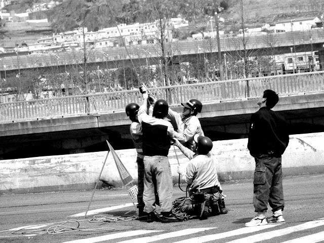 그것은... 네 명은 케이블을 당기며 고생을 하지만 한 명은 주머니에 손을 넣은 채